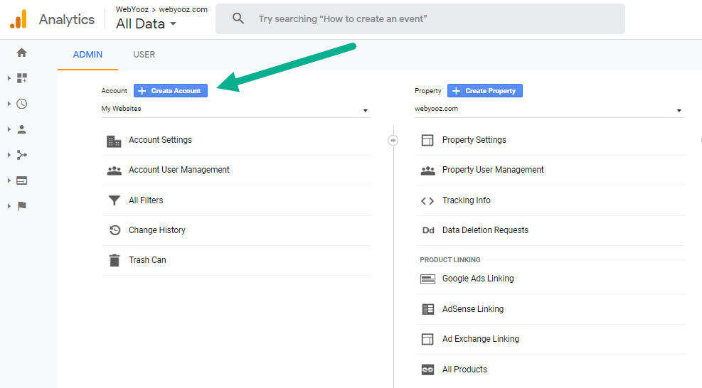 اگر از قبل در گوگل آنالیتیکس دارای اکانت باشید، جهت ایجاد اکانت جدید، ابتدا روی آیکون چرخ دنده در پایین صفحه سمت چپ، کلیک کنید تا به صفحه Admin وارد شوید و سپس مطابق با تصویر زیر روی دکمه Create Account کلیک کنید. ولی اگر برای اولین بار است که قصد ثبت سایت در گوگل آنالیتیکس را دارید، به مرحله بعدی بروید.