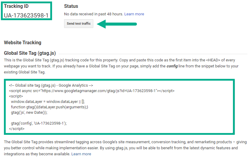 پس از آن، گوگل آنالیتیکس به شما یک Tracking ID می دهد که از این به بعد سایت شما با آن شناسایی می شود. همچنین یک اسکریپت به نام Global Site Tag به شما داده می شود که باید آن را در <head> همه صفحاتی که قصد دارید ترافیک آن را آنالیز کنید قرار دهید و از آنالیزها و گزارش بی نظیر گوگل استفاده ببرید و وبسایتتان را بهتر و هوشمندانه تر مدیریت کنید. همچنین از بسیاری از گزارش ها می توانید در راستای بهینه سازی برای موتور جستجو استفاده کنید.