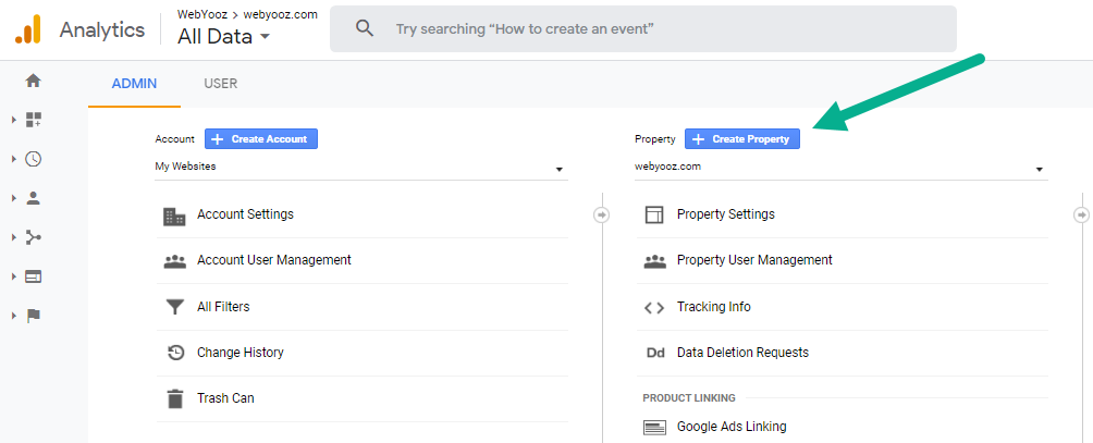 در صورتی که از قبل دارای اکانت باشید و قصد ایجاد اکانت جدید در آنالیتیکس را نداشته باشید، کافیست مطابق تصویر زیر، در اکانت موجود، با کلیک بر روی دکمه Create Property نسبت به اضافه کردن یک سایت جدید اقدام کنید.